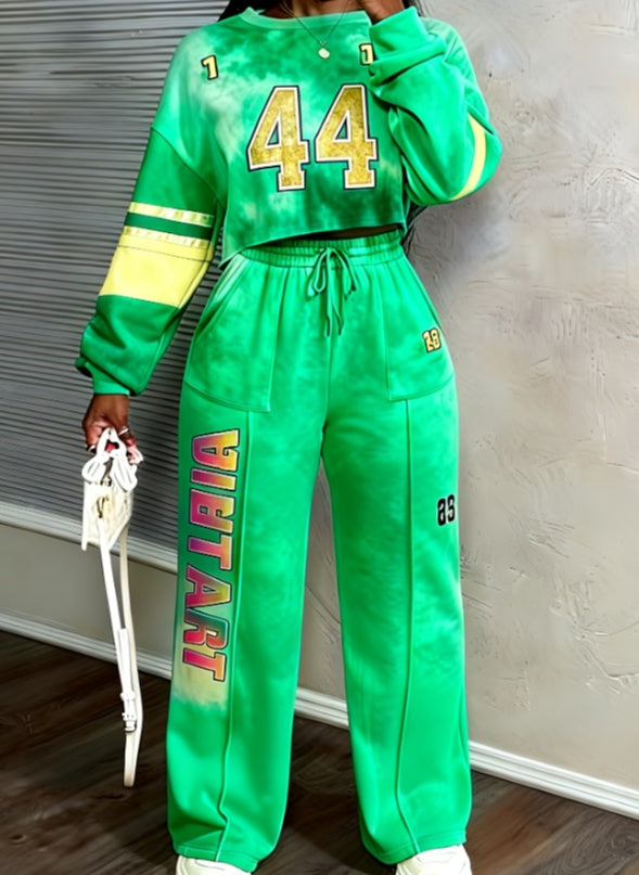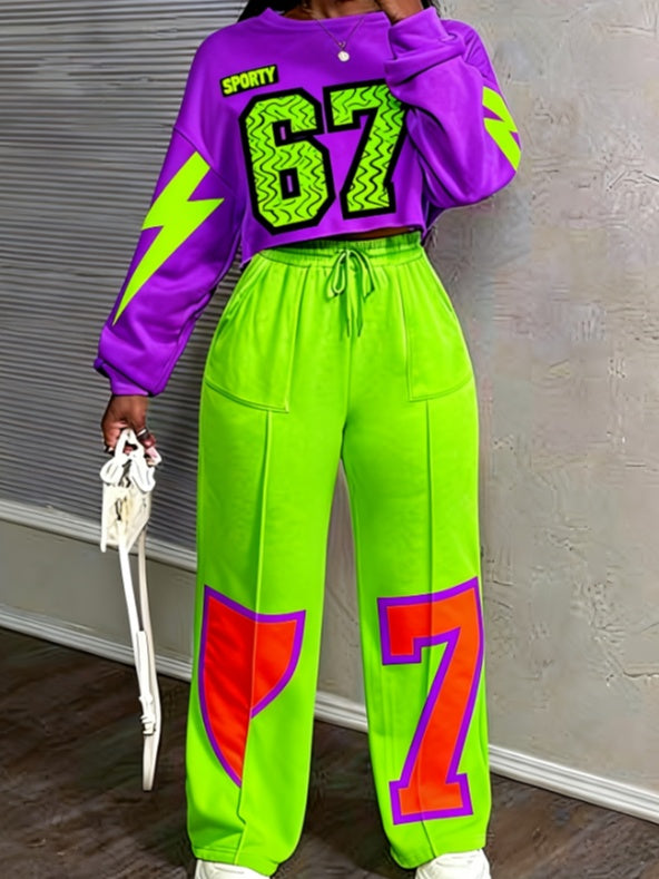 Style: Retro sporty + Casual sweet and cool Neckline: Crew neck Sleeve type: Long sleeve Fit: Crop top + wide-leg pants set Design: Print + drawstring wide-leg pants