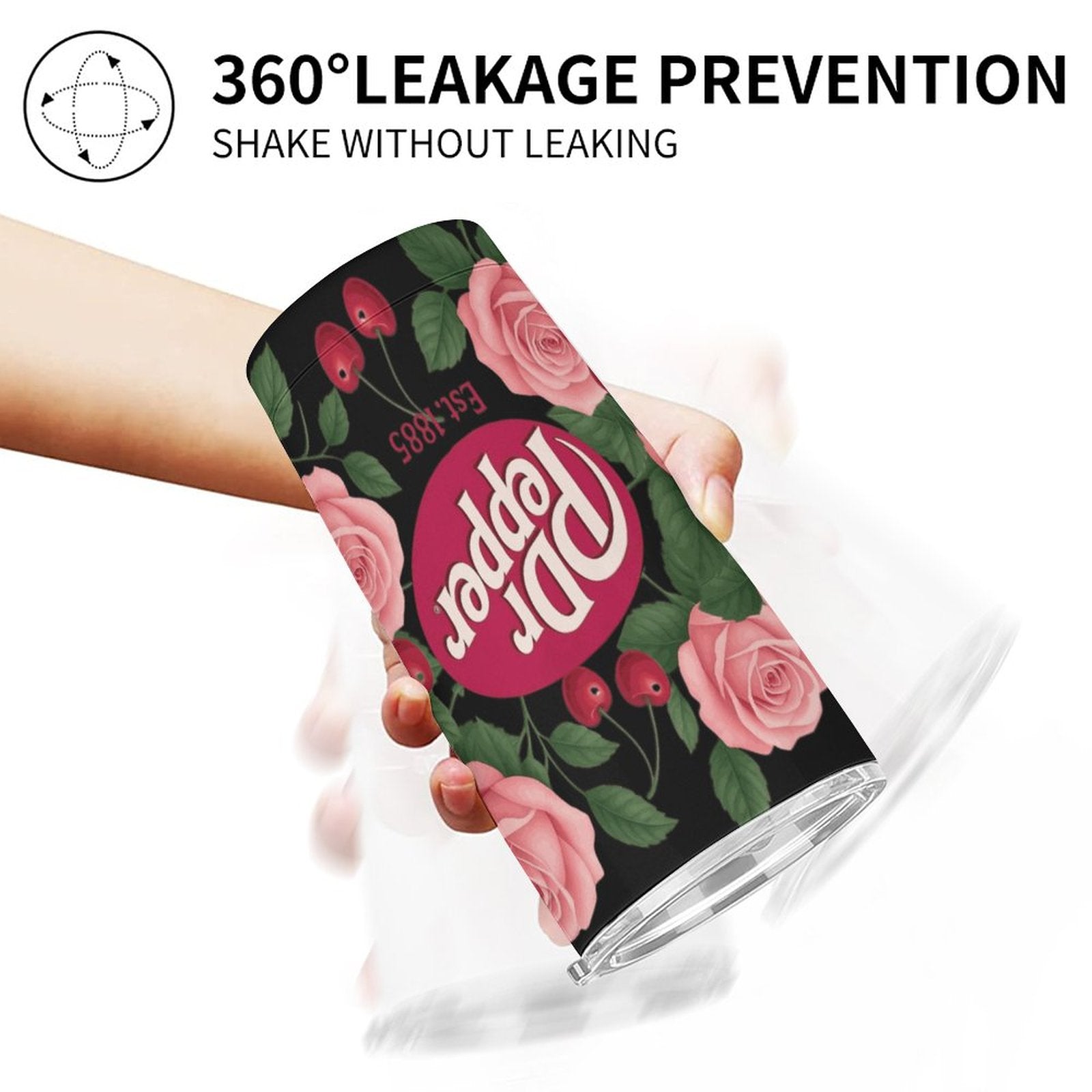 Dr. Pepper Black & Pink Floral Tumbler with Straw | Vintage Cherry Rose Insulated Travel Cup | 20oz Stainless Steel Tumbler