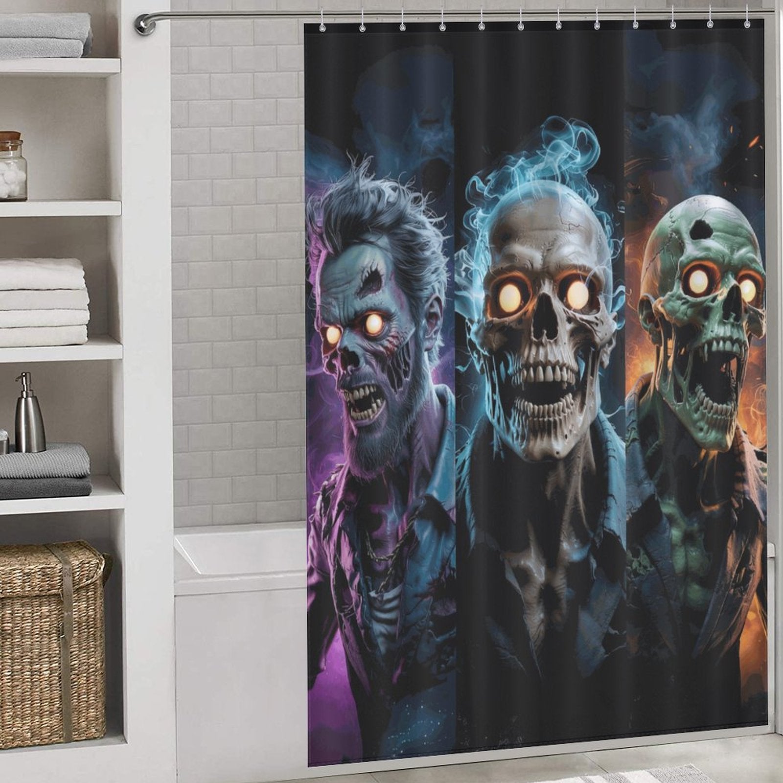 Transform your bathroom into a haunted masterpiece with this Scary Zombie Skull / Halloween Gothic Creepy Bath Curtain. Featuring three glowing-eyed skeleton zombies with smoky, fiery details, this curtain is perfect for horror fans, Halloween lovers, and anyone who loves a bold gothic vibe. Made with durable waterproof polyester, this curtain brings a unique, spine-chilling aesthetic to your bathroom.